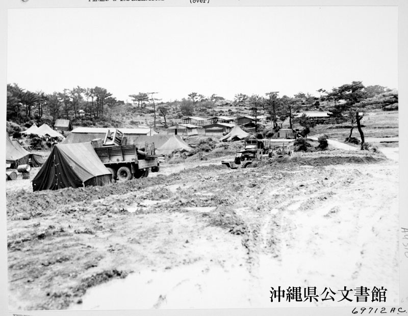 【和訳】 雨で道路がぬかるんだため困難を来している本部地区でのビル建設工事。写真は住A-1、A-2、A-3、A-4。沖縄。