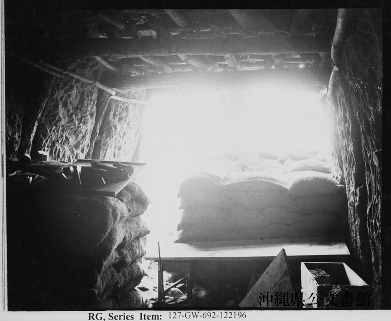【和訳】 本部半島--日本軍の貯蔵壕の内部は、重機関銃のトーチカとしても使用された。