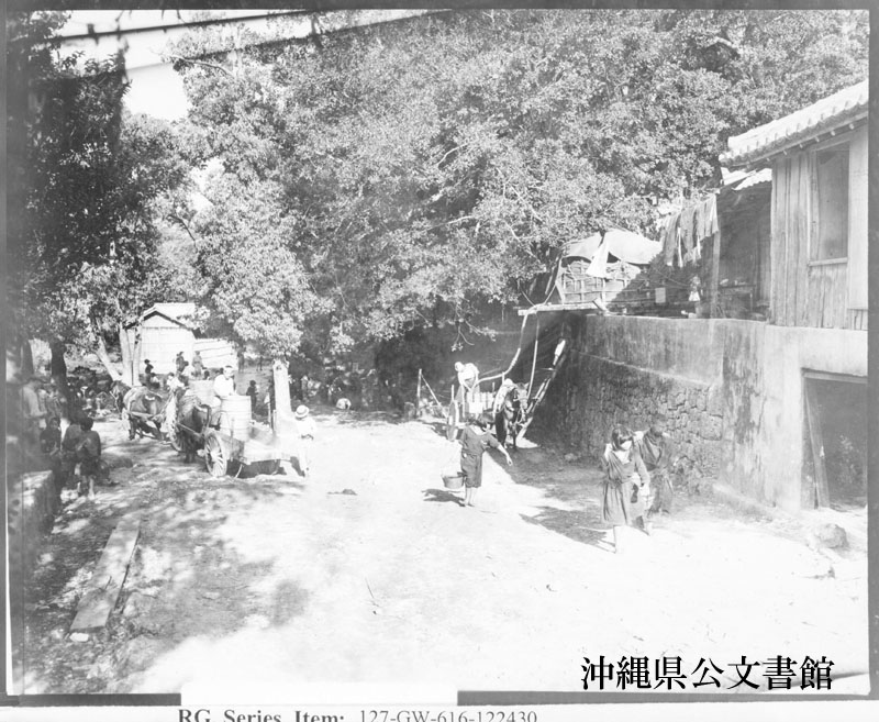 【和訳】 給水地へ続く道沿いで撮られた写真。軍政府本部用の水を[右上]の組み立て式桶から荷馬車に引いている