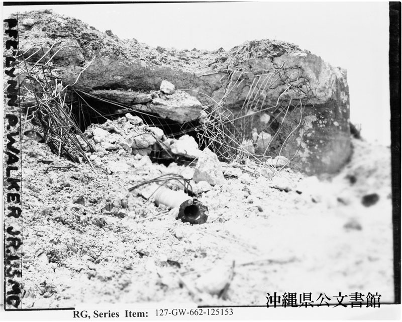 【和訳】 小禄半島--大破した海軍の155ミリ砲台。直撃でしかこれくらい完璧な破壊はできない。