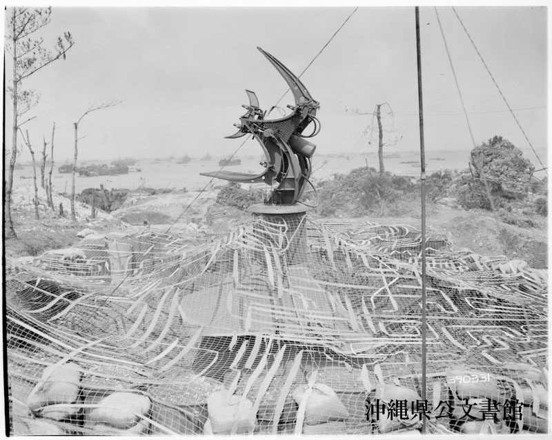 【和訳】 第16高射砲兵大隊G中隊。渡具知ビーチにある20型レーダーサーチライト管制塔と砲座。