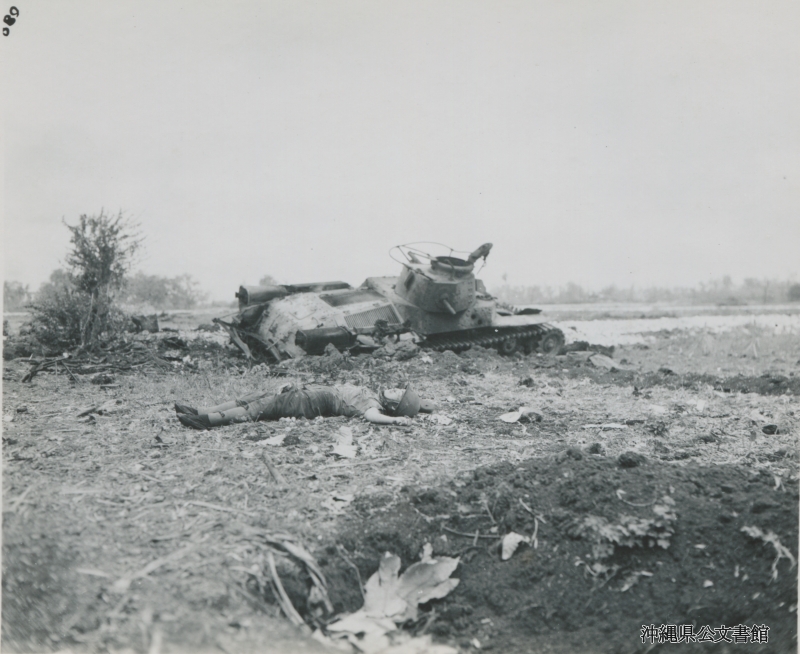 【和訳】 海兵隊の火炎放射器により動かなくなった戦車の横に横たわる日本兵将校の死体。