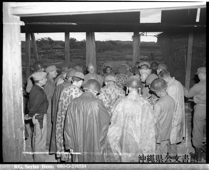 【和訳】 日本軍作戦室があった読谷飛行場の建物で記者会見を行うニミッツ元帥。一番左端にいるのは、スミス中佐。同中佐は、報道担当官で、沖縄での作戦に関する全ての写真撮影付きの会見を担当した。