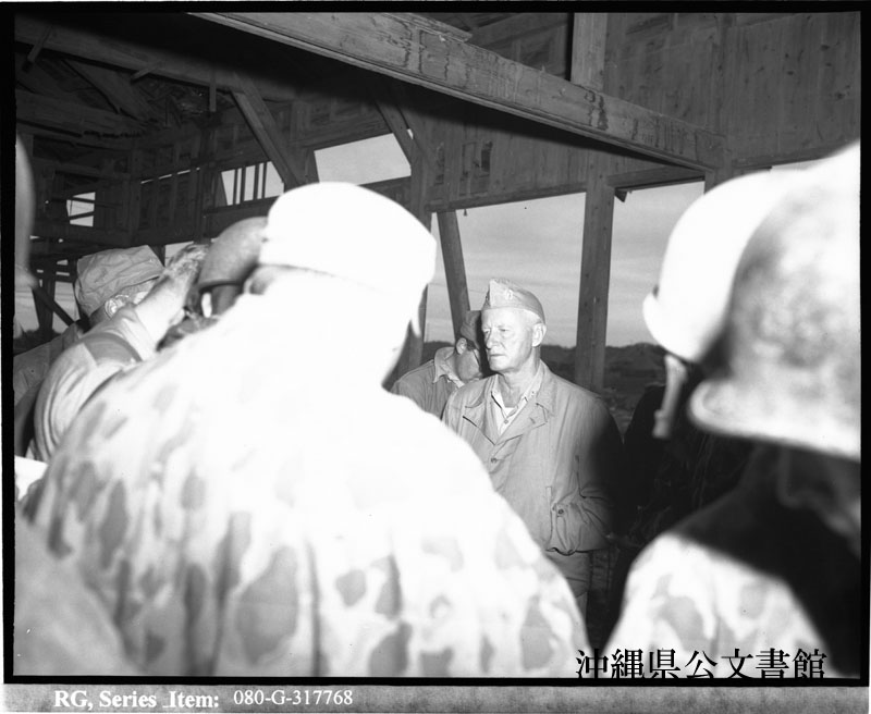 【和訳】 日本軍の作戦室があった建物で記者会見を開いているニミッツ元帥。読谷飛行場にて。