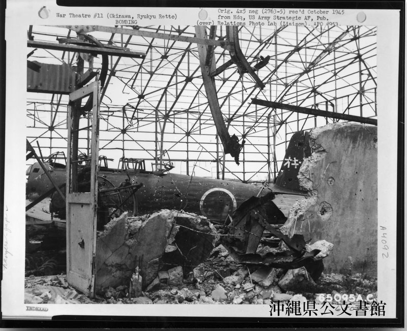 【和訳】 格納庫のねじれた鉄骨と破壊した飛行機。米海兵隊が那覇飛行場を攻略した際に発見し、その地域への爆撃の効果を知る。