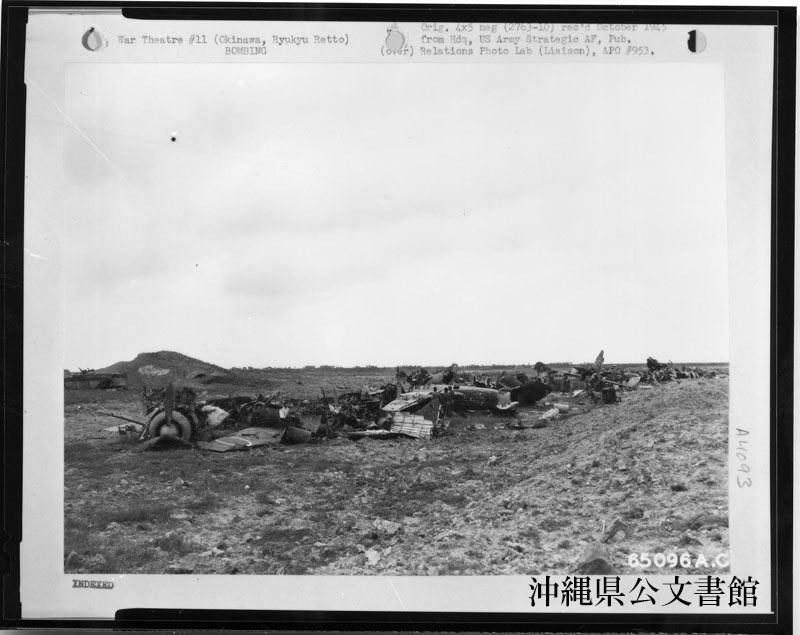 【和訳】 1945年に米海兵隊が攻略した直後の那覇飛行場と破壊した飛行機。