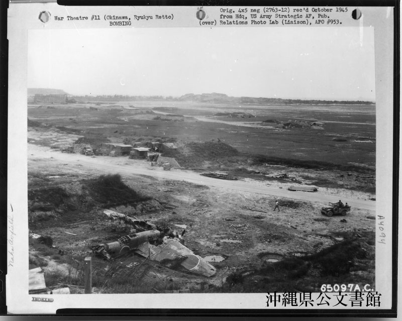 【和訳】 1945年に米海兵隊が攻略した直後の那覇飛行場の概観。手前に見えるのは爆撃によってできた弾孔。