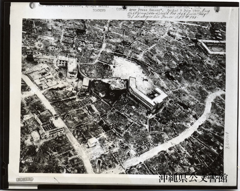 【和訳】 地上部隊と協力する陸軍航空隊観測機から撮影した沖縄の中心地、那覇。ほぼ完全に一掃されたのがわかる。