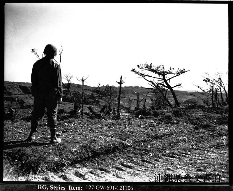 【和訳】 先ごろ攻略した“ウィルソン丘陵”の頂上に立ち、那覇に向かって“スカイライン・リッジ”を見渡す海兵隊員。第1大隊がウィルソン丘陵を奪取し、眼下の“安波茶ポケット”にいる日本軍を掃討した。