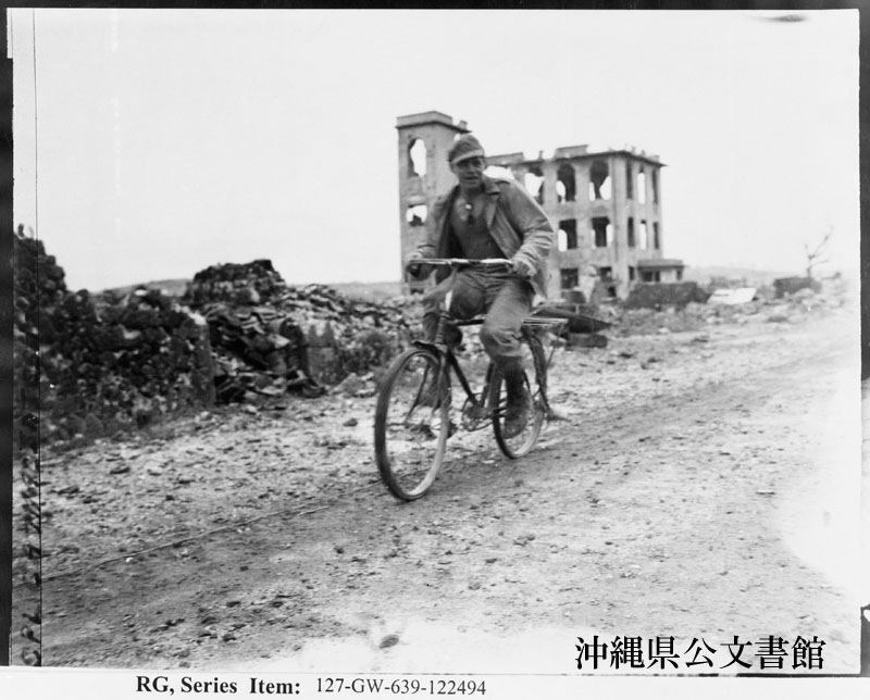 【和訳】 ひどく変形しているもののまだ使える自転車をどこからか見つけてきた海兵隊員。自転車に乗って那覇の「中心街」を行く。
