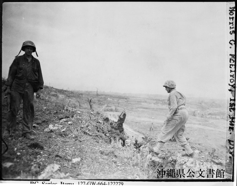 【和訳】 前線の偵察所に向かう途中、珊瑚が隆起した丘陵で、深さ12フィートの裂け目をひょいと飛び越えるデルヴェール少将。この丘陵は、日本軍壕に続く小道の途中にある。ここは現在、首里-那覇の前線を監視する偵察所となっているが、第1海兵師団が猛攻撃を加えて攻略するまでは、日本軍の拠点だった。