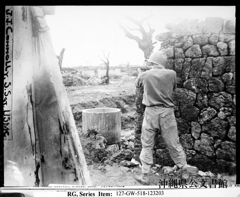 【和訳】 日本軍狙撃兵が顔を上げるのを待ち構える海兵隊狙撃兵。那覇にて