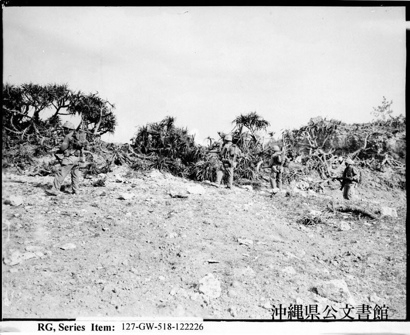 【和訳】 那覇郊外の砲座を取りまく海兵隊員。ここで8人の日本兵が見つかった