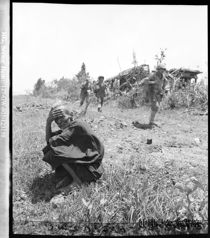 【和訳】 途方にくれた那覇市民の横を走り去る第3海兵軍団第22部隊の海兵隊員