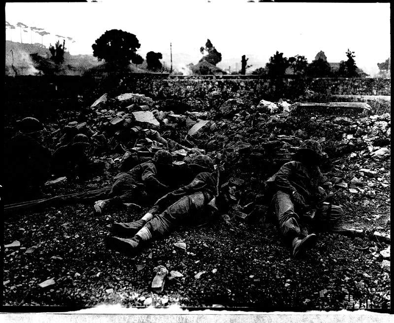 【和訳】 沖縄の県都、那覇を攻略しようとするが身動きの取れない海兵隊員。