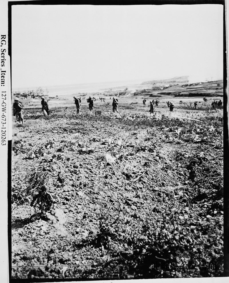 【和訳】 那覇へ向かって、丘を越え始めた第22海兵連隊第1大隊B中隊。