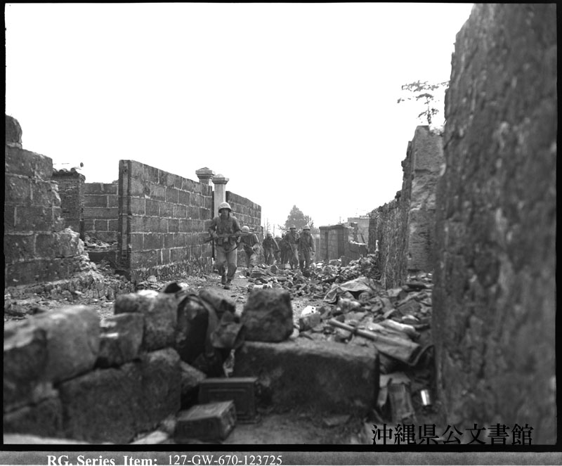 【和訳】 狙撃兵捜索--日本軍狙撃兵がいるかどうか那覇の廃墟を捜索する第6海兵師団の哨戒兵。