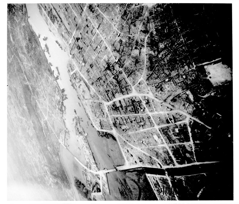 【和訳】 爆撃機(B-29)や米太平洋艦隊艦載機の爆撃により、壊滅状態になった、沖縄の中心地・那覇市の様子。空母イントレピッド(CV-11)の艦載機から撮影。