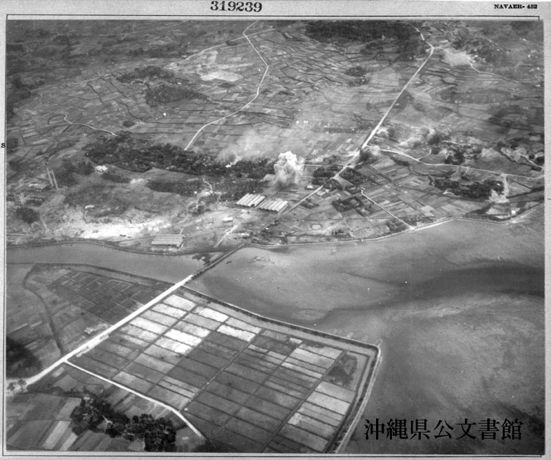 【和訳】 那覇の北にある橋とその周辺施設が、第58機動部隊から攻撃を受けている様子。上陸日前。空母ハンコック(CV-19)の艦載機から撮影。