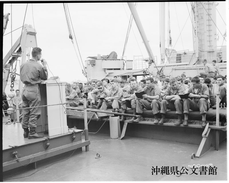 【和訳】 金武ビーチで行われる陸海軍合同演習「コーラル・ヘッド作戦」の前日、APA輸送船上で陸・海軍兵士のために礼拝を執り行う第29歩兵連隊モス従軍牧師
