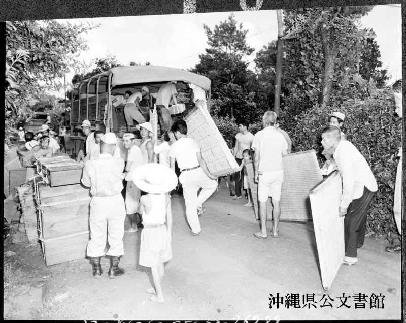 【和訳】 石垣に出発する前陸軍車両に家財道具を積め、友人に別れを告げる大宜味村の住民