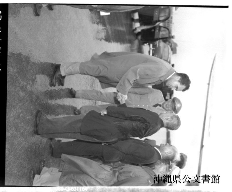 到着直後の副大統領を迎える護得久立法院議長。右側に立っているのは琉球政府行政主席の比嘉秀平氏。
