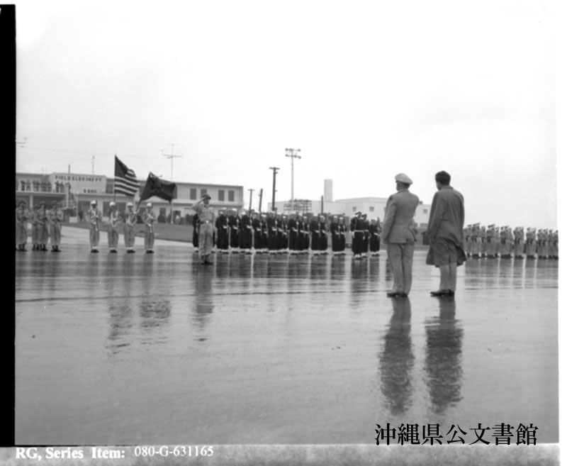 沖縄に駐留する米海陸空軍の儀仗兵から栄誉礼を受ける副大統領とオグデン陸軍少将。