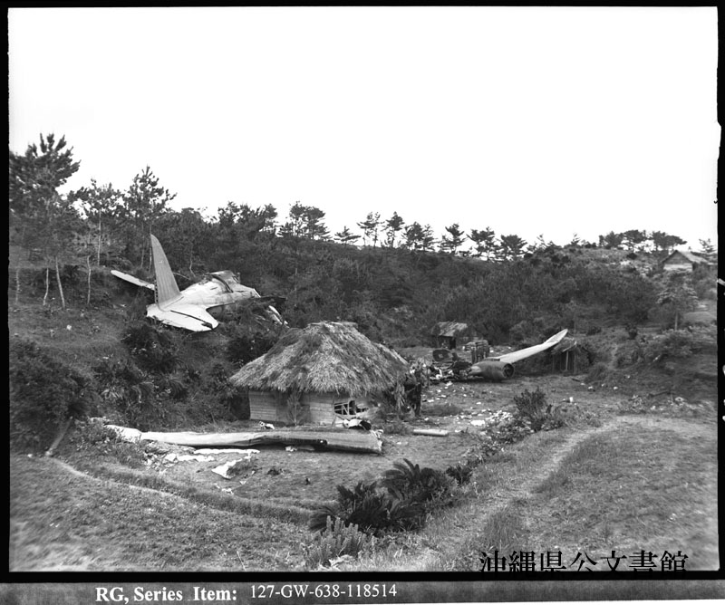 【和訳】 沖縄の谷に墜落した陸軍双発エンジン輸送機の残骸。