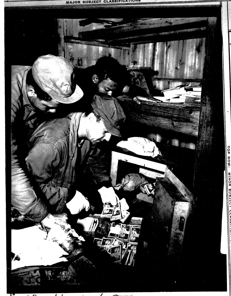 【和訳】 名護市役所の金庫から総額5000円の日本貨幣を取り出す、軍政府職員で米海軍予備役部隊のズベランド少佐ワシントンD.C.出身)。