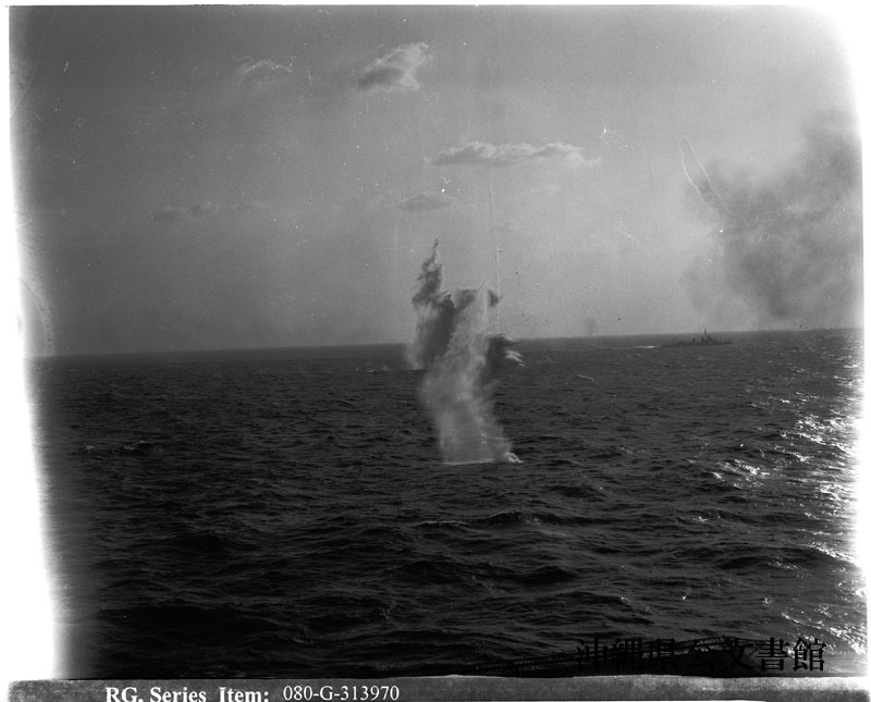 【和訳】 空母バンカー・ヒル (CV-17)の攻撃を受け、駆逐艦近くに墜落し水しぶきをあげる日本軍機。琉球列島沿岸にて。