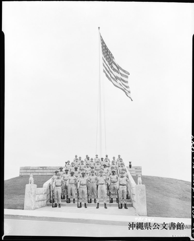 【和訳】 ライカム第9軍で開かれた国旗降下式に参加するタイシンガー一等軍曹率いる第663野戦砲兵大隊の練兵