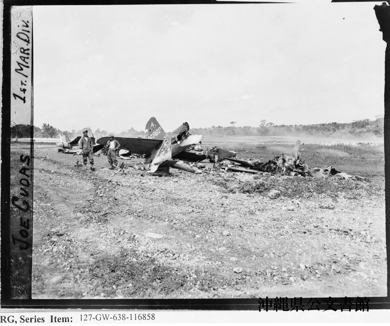 【和訳】 めちゃくちゃに壊れた日本軍機がこのように山積みになって飛行場中に散乱した。このような残骸が200あるいはそれ以上にのぼった。