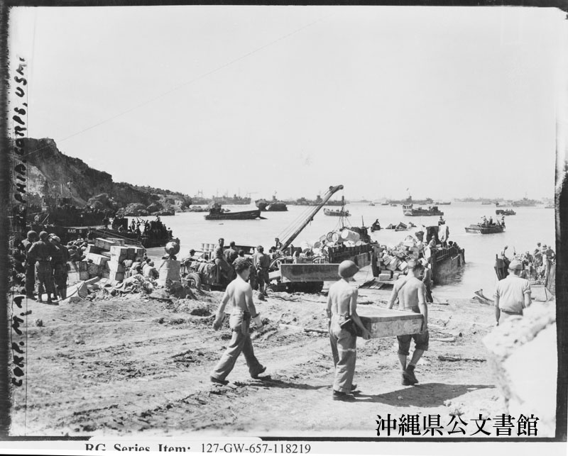 【和訳】 水の入った明るい色のドラム缶を陸揚げする、上陸した汎用揚陸艇。クレーンはトラックを積むために使われる。