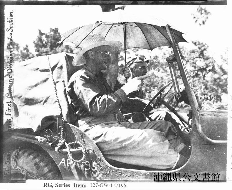【和訳】 沖縄の(灼熱の)太陽を二重に防御——沖縄製麦わら帽と日傘で陽射しを避けながら前線に近い指揮所へ向かう米海軍軍医キンバラ大尉