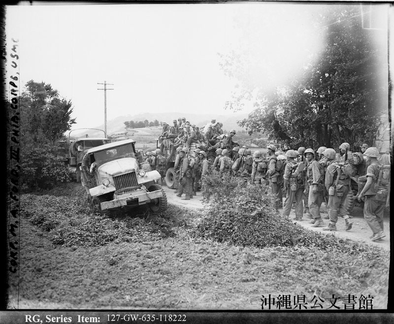 【和訳】 狭い道から滑り落ち、溝から抜け出そうとする海兵隊のトラック。部隊はそばを通って前線まで移動を続ける。