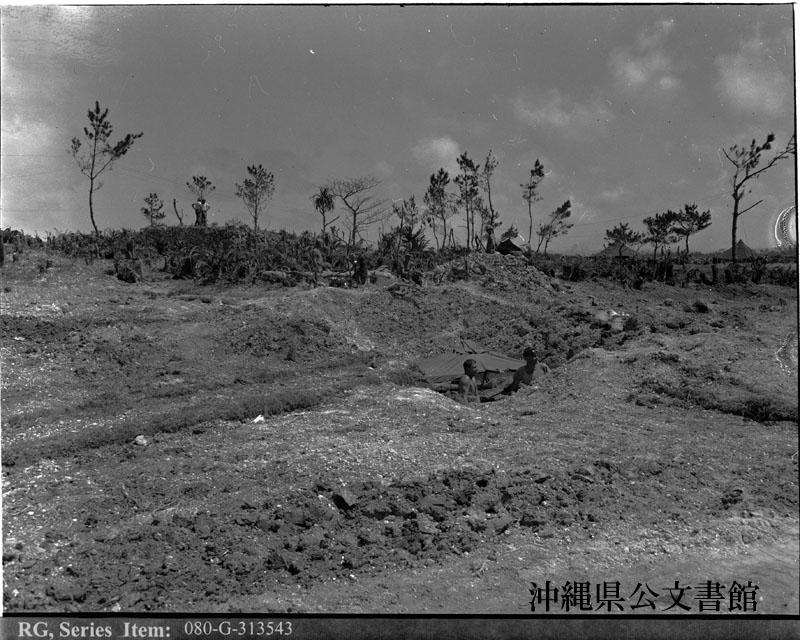 【和訳】 塹壕を掘る海兵隊員。侵攻後、沖縄にて。