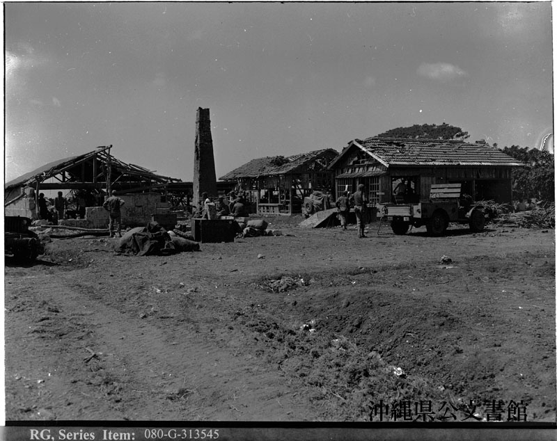 【和訳】 廃墟となった集落で現地司令部の設置にとりかかる海兵隊員。沖縄にて。