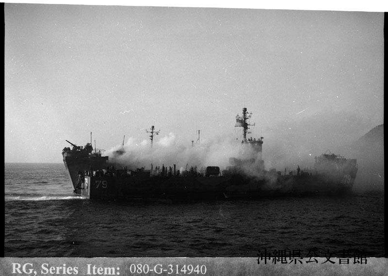 消火活動を手助けする戦車揚陸艦 (LST-79)。