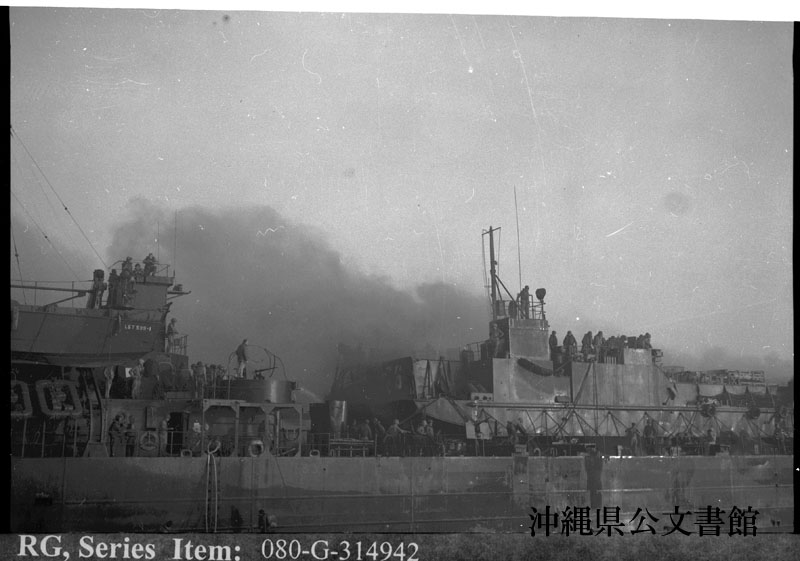 【和訳】 慶良間諸島で停泊中に、零式艦上戦闘機“ジーク”と思われる日本軍用機が激突し、燃上する戦車揚陸艦 (LST-599)。