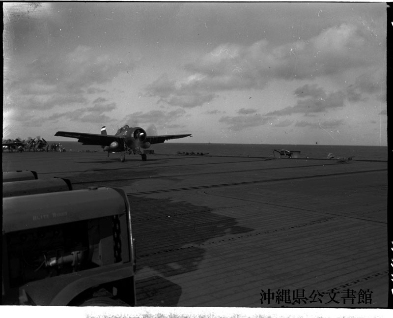 【和訳】 沖縄攻撃のため、空母マキン・アイランド(CVE-93)から発艦するF4F機 。