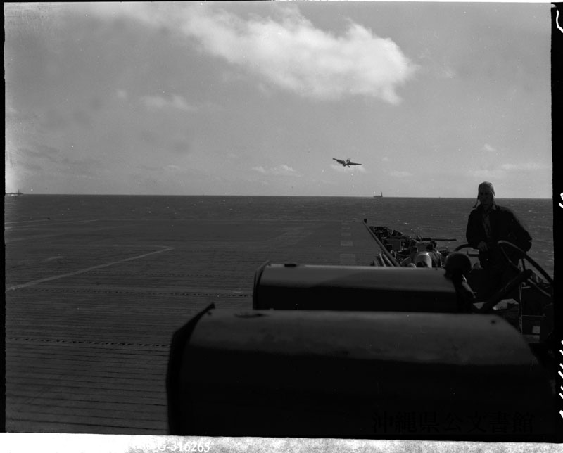 【和訳】 沖縄攻撃のため、空母マキン・アイランド(CVE-93)から発艦するF4F機 。