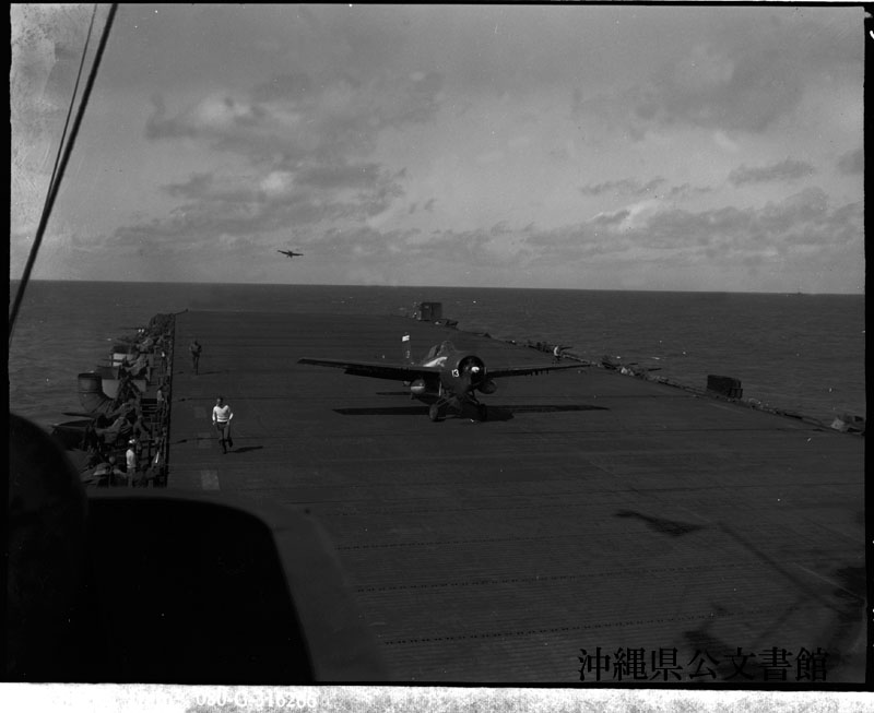 【和訳】 沖縄攻撃後、空母マキン・アイランド(CVE-93)に帰投する米軍機。