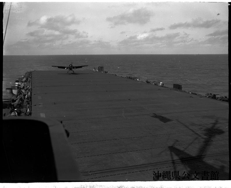 【和訳】 沖縄攻撃後、空母マキン・アイランド(CVE-93)に帰投する米軍機。