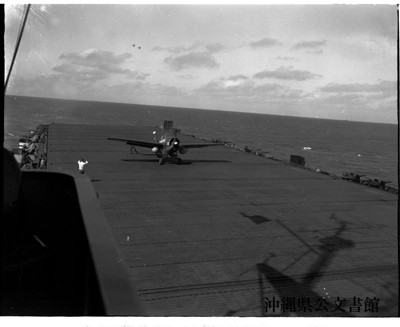 【和訳】 沖縄攻撃後、空母マキン・アイランド(CVE-93)に帰投する米軍機。