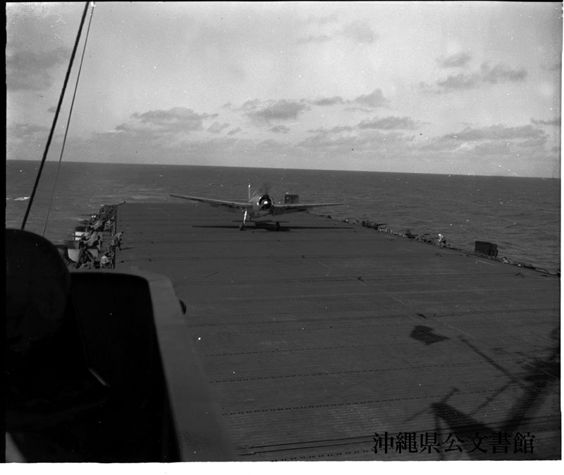 【和訳】 沖縄攻撃後、空母マキン・アイランド(CVE-93)に帰投する米軍機。