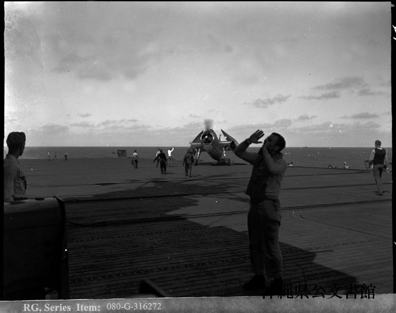 【和訳】 沖縄攻撃から帰投し、翼をたたんだTBM機。空母マキン・アイランド(CVE-93)の甲板にて。