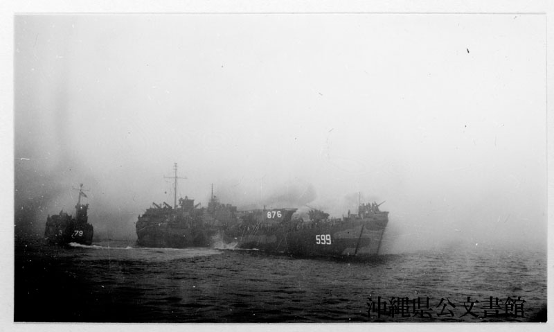 【和訳】 「ジーク」(零戦)と思われる日本軍機による攻撃を受け炎上する上陸用舟艇599
