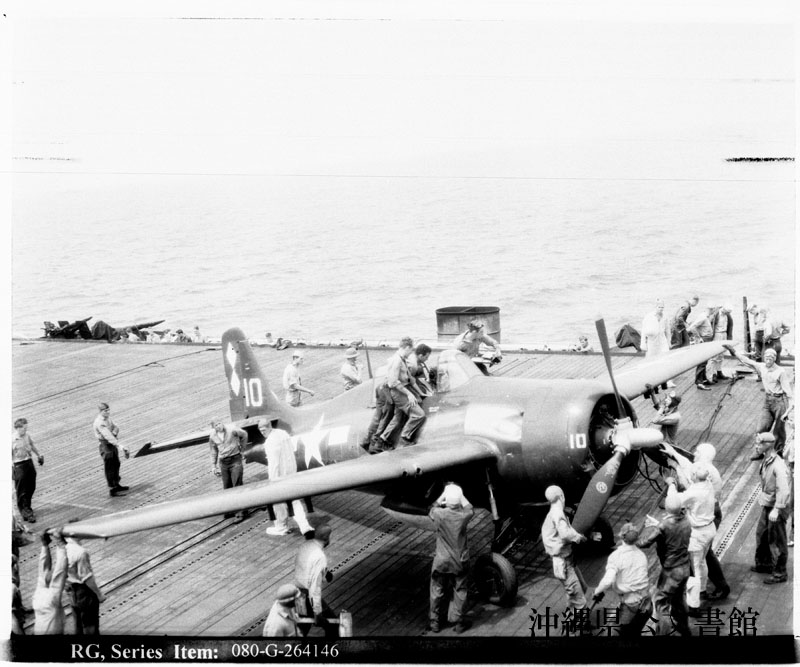 【和訳】 VC-83部隊のFM-2第10番機。沖縄海域の空母サージャント・ベイ(CVE-83)の甲板。