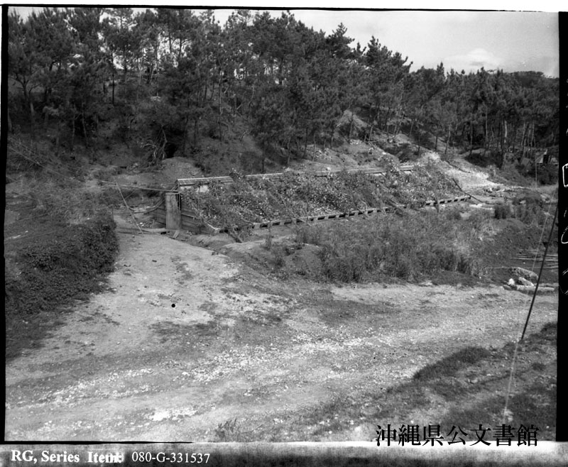 【和訳】 カモフラージュされた日本軍の下士官用兵舎。沖縄本島にて。