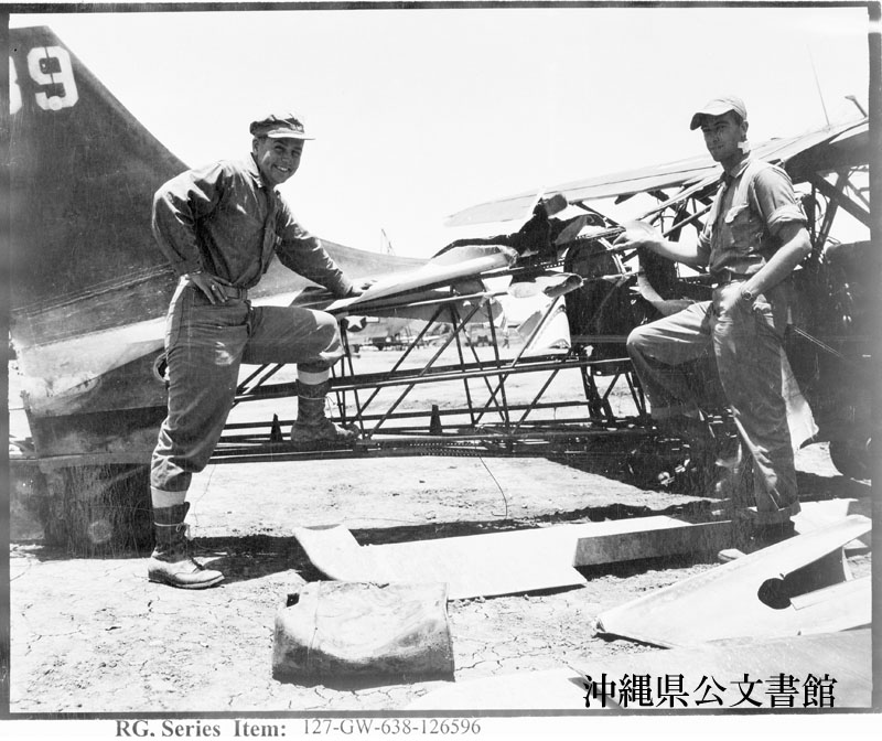 【和訳】 海兵隊マクドナルド中尉(ペンシルバニア州出身、左)とマンレー中尉(ミシガン州出身)。“空飛ぶジープ”と撮影。2人ともこれに乗って沖縄南部の日本軍の防衛線に対する目標偵察任務を行った際、負傷し、危うく撃ち落とされるところだった。